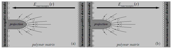 In the negative half-period of , when an electron is emitted from the top of the projection (or from the polymer matrix around the top), the electron should be accelerated by , being constantly scattered in the polymer matrix around the top. After losing the kinetic energy in the scattering process, the electron (or its relaying electron) should be finally trapped in a localized state, becoming a space charge in the polymer matrix, as indicated in Figure 1a.
