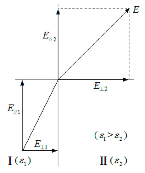 Because of microscopic structural complexities, the dielectric capacity may not be constant in the polymer matrix, and the alternating electric field should be weaker in a region with a higher dielectric constant () and stronger in a region with a lower dielectric constant. As a result, the propagation rate of the electrical tree should be different, and the propagation of the electrical tree may be deflected. There is another factor causing the propagation of the electrical tree to be deflected when the dielectric constant is not consistent. As shown in Figure 2, when the instantaneous macroscopic electric field is spreading across the interface of adjoined regions, I () and II (), polarized charges would be present on the interface and the components of on the interface should have the following relations [15]: