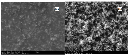 On the basis of the propagation mechanisms of electrical trees presented in this paper, the corresponding interpretations may be clearly given. In the corona process, alternating current (Formula (3b)) would pass through the decomposition channel of the electrical tree, presenting the alternating electric quantity (Formula (3a)) on the tip of the electrical tree, stimulating the enhanced local electric field . For the polymer/nano-particles composite material, the decomposition of the polymer material would propagate tortuously forward into the composite matrix, avoiding the nano-particles due to the high corona resistibility that they possess. As a result, the polymer material around the nano-particles would be gradually decomposed and evaporated, leaving the nano-particles behind in the decomposition channel and on the surface of the composite matrix. In this case, the nano-particles would be aggregately deposited due to the high surface energy they possess. The decomposition channel of the electrical tree would be eventually blocked by the deposited nano-particles, shutting off the alternating current in the decomposition channel. Consequently, the propagation of the decomposition channel would be restrained in the corona process. In reality, in the corona process, following the decomposition of polymer material, the surface layer of the polymer/nano-particles composite matrix is gradually collapsed, leading to the deposition of nano-particles with disorganized morphologies. As a result, the initiation of electrical trees is restrained in the corona process. The morphologies of the PI/TiO2 composite films before and after the corona experiment are presented in Figure 7. Since the initiation and the subsequent propagation of electrical trees would be restrained in the corona process, the corona resistibility of the polymer/nano-particles composite material is inevitably improved.