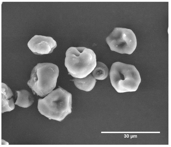 An FTIR analysis of the native starch and microparticles was performed on a VERTEX 70 FTIR spectrometer (BRUKER, Billerica, MA, USA) in absorbance mode, with a high sensitivity DLaTGS detector at room temperature. The samples were measured in ATR mode, with a A225/Q PLATINUM ATR Diamond crystal (Billerica, MA, USA) with single reflection accessory. The spectra were recorded from 4000 to 500 cm−1 with a resolution of 4 cm−1.