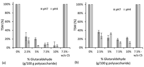The use of dialdehydes, such as glutaraldehyde or glyoxal, as crosslinking agents for polysaccharides is commonly mentioned in the literature [,,]. A straightforward form of evaluating the effectiveness of the crosslinking reaction is by determining the product solubility. As new intermolecular covalent bonds have been formed, the water solubility is expected to decrease significantly. SCM with different amounts of glutaraldehyde were prepared, and the particles’ solubility was measured using two different assays, after 24 h immersion at room temperature, and after 1 h immersion in boiling water. As chitosan is insoluble at a neutral pH and completely soluble under acidic conditions (pH < 5), because of the hydrophilic character of the protonated amine groups, the particles’ solubility was evaluated for two pH values (7 and 4). Figure 2 presents the results obtained in terms of the total soluble matter (TSM).