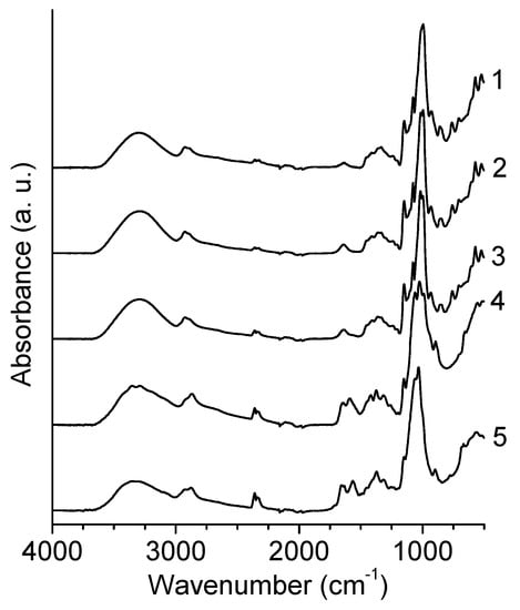 FTIR spectra of: (1) native starch, (2) starch + 7.5% glutaraldehyde, (3) starch + 10% chitosan + 7.5% glutaraldehyde, (4) chitosan, and (5) chitosan + 7.5% glutaraldehyde.