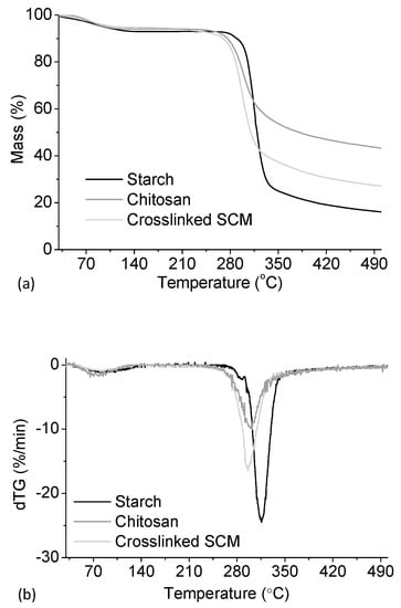 Thermogravimetric curves were obtained for the native corn starch, chitosan, and SCM crosslinked with 7.5% glutaraldehyde. These are shown in Figure 4.