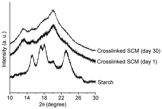 X-ray diffraction measurements were performed on native cornstarch granules and on SCM crosslinked with 7.5% glutaraldehyde. For the SCM, the XRD spectra were obtained one day and 30 days after production, in order to evaluate the possible changes in the crystallinity over time. A 30-day period is considered sufficient for retrogradation to occur in starch molecules after gelatinization [,,]. Figure 5 presents the XRD diffractograms in the range 2θ = 10–30°.