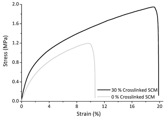 Representative stress-strain curve obtained for thermoplastic starch containing 30% SCM crosslinked with 7.5% glutaraldehyde and without SCM.