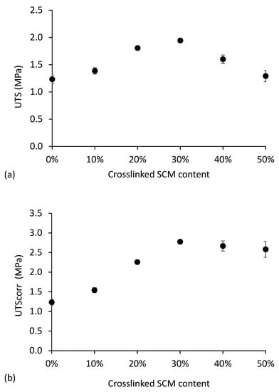 Ultimate tensile strength (UTS) (a) and corrected ultimate tensile strength (UTScorr) (b) as a function of crosslinked SCM content in thermoplastic starch.