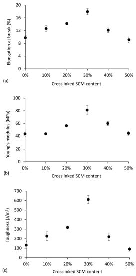 Elongation at break (a), Young’s modulus (b), and toughness (c) as a function of crosslinked SCM content in thermoplastic starch.
