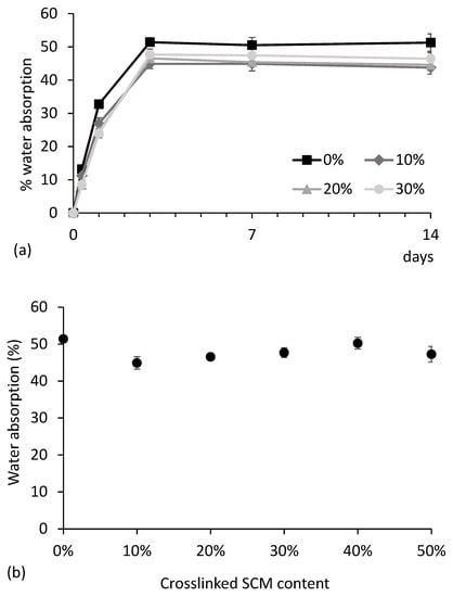 Examples of water uptake at 100% relative humidity for some crosslinked SCM contents in thermoplastic starch (a), and equilibrium water absorption after 3 days as a function of crosslinked SCM content (b).