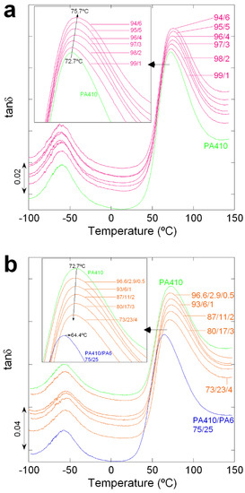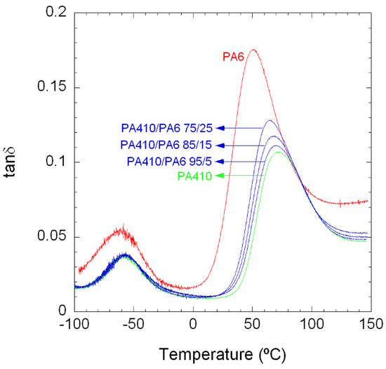 Figure 1 shows the tanδ vs. temperature curves of neat PA410, PA6, and their PA410/PA6 blends up to a 25% PA6 content. As can be seen, both PAs and all the blends show two peaks, which correspond to the α (high temperature peak) and β (low temperature peak) relaxations [24,25]. The α relaxation is the mechanical manifestation of the glass transition temperature or Tg. The β relaxation hardly changes with blend compositions and is almost the same for both neat PA6 and neat PA410. This low temperature transition is known to be related to local range motions within the chains which are very similar for the two types of polyamides employed here and their blends.