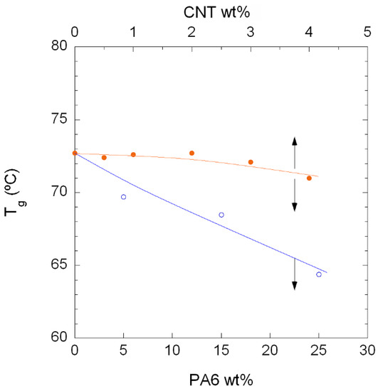 In order to observe the combined effect of the PA6 and the presence of the CNTs in greater detail, Figure 6 shows the Tg values of the unfilled PA410/PA6 blends (open symbols) and the PA410/PA6/CNT NCs (filled symbols) vs. the PA6 and CNT content. As the figure shows, the vertical distance between the two lines increases as the CNT content increases, indicating that the decrease in Tg caused by the PA6 in the NCs was mostly offset by the restricted mobility of the polymer chains around the CNTs. The overall thermal behaviour of the NCs can be considered positive, because even at the highest PA6 content (23%), the Tg of the corresponding 73/23/4 NC showed a limited 1.7 °C decrease with respect to the neat PA410.