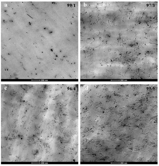 When a specific matrix-based masterbatch is not commercially available, blending that matrix with another polymer-based masterbatch, as long as the latter polymer is miscible or compatible with the former, has proved an effective means of obtaining good CNT dispersion levels. Gonzalez et al. [22] diluted a polybutylene terephthalate (PBT)/CNT masterbatch in polyetherimide (PEI) in order to obtain high performance PEI-based nanocomposites. They confirmed that PEI and PBT were fully miscible and observed that the nanotubes were efficiently dispersed in the PEI-rich matrix, mostly in the form of single nanotubes. They obtained a pc close to 1 wt %, clearly lower than that observed in highly dispersed PEI-based NCs using the ultrasound-assisted melt processing method (2 wt %) [23]. Furthermore, the increase observed in the modulus was similar in both cases. Arboleda-Clemente et al. [2] studied the effect of the PA ratio and the masterbatch used, PA66/CNT or PA6/CNT, on the CNT dispersion of PA66/PA6/CNT NCs. They attributed the higher conductivity values obtained with the 50/50 PA66/PA6 CNT composites to the greater degree of miscibility between the PAs in the composition, among other factors.