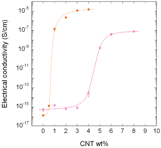 As can be seen in Figure 9, the conductivity changed in both cases by over 7–8 decades, indicating that electrical percolation of the filler took place. However, when the curves of both systems are compared, the maximum conductivity value obtained is clearly higher (namely, three orders of magnitude), and electrical percolation took place at significantly lower CNT contents in the ternary PA410/PA6/CNT NCs than in the binary PA410/CNT NCs. The percolation threshold was calculated using a simple power law [31] and the values obtained were 3.98 wt % for the PA410/CNT binary system and 0.65 wt % for the PA410/PA6/CNT ternary system.