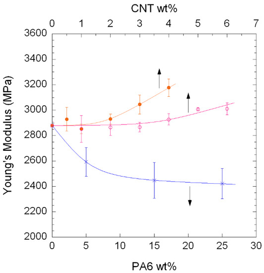 Young’s modulus of PA410/CNT NCs (○), PA410/PA6/CNT NCs (●), and unfilled PA410/PA6 blends (x).