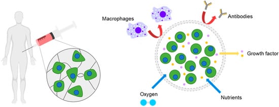 Despite the considerable potentials of a stem-based therapy described above, its therapeutic efficacy is often unsatisfactory in in vivo studies. One of the reasons for this is that the transplanted stem cells lose significant viability post transplantation [11,12,13]. Injured or damaged tissues present unfavorable environments for cell growth, such as reactive oxygen species and the host’s immune responses. Also, the lack of cell-supporting signals around the transplanted stem cells leads to the eventual death of the transplanted cells. As a result, many studies have focused on stem cell transplantation with substances that can support cell survival, induce their bioactivity, and enhance cell retention at the administered sites [14,15,16]. In particular, hydrogels, which can provide tissue-like environments, have been extensively studied as delivery vehicles for stem cells. Importantly, the transplantation of stem cells in uniform micro-sized hydrogels offers convenient administration by injection in a minimally-invasive manner, allowing for patient convenience and the reduction of infection, as well as the promotion of cell viability and retention, possibly leveraging therapeutic activities of transplanted stem cells post implantation (Figure 1) [17,18]. Accordingly, many methods developed for cell microencapsulation have been recently employed for stem cell encapsulation and transplantation. Also, the properties of micro-sized hydrogels have been further tailored using proper biomaterials to obtain specific responses from stem cells for specific outcomes as stem cells sensitively respond to the properties of surrounding materials.