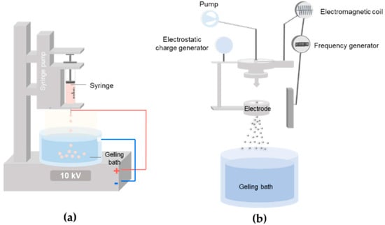 A vibrational technology uses a vibrating nozzle for a feeding solution to generate dispersed droplets (Figure 3b). As the vibration progresses in the Plateau-Rayleigh instability region of resonance, droplets of uniform distribution are formed. In many cases, a vibrating nozzle is equipped with electrospraying systems, in which an electrical field stabilizes the droplet jet and disperses the droplets without aggregation. The sizes of generated droplets are adjusted by changing the vibrational frequency, amplitude of vibration, solution pumping rate, and distance between the nozzle and the gelling bath [37,38].