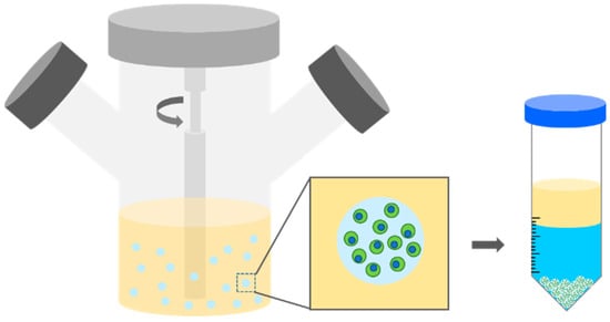 Cell embedded polymer solution droplets are formed conventionally in an oil phase via a water-in-oil emulsion (Figure 6) [36,47,48,49]. Hoesli et al. created a water-in-oil emulsion by agitating alginate solution with CaCO3 in mineral oil. Then, internal gelation occurred to form microgels during and after emulsion. Emulsified hydrogels were easily collected from the oil phase by centrifugation. Emulsification possesses several important advantages for cell encapsulation, including low equipment cost, low production cost, and scalability. However, this method has raised concerns, such as broad size distribution and cell damage at the oil interfaces.
