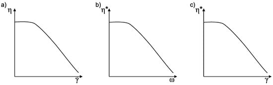 The dependency of complex viscosity on applied shear strain amplitude is schematically shown in Figure 1c. A pronounced shear-thinning is observed in this case, as well [37,38]. The impact of oscillatory strain on particle networks, in the case of viscosity, is higher for low molecular weight polymers [39]. Richter et al. showed by experiments and a theoretical approach that shear amplitude leads to a change of particle clusters [40]. An increase of and conductivity at small deformations is reported by Handge et al. [41] and a decrease of conductivity with accompanying shear-thinning for high strains by Zeiler et al. [42].