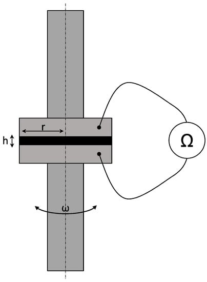 In a previous study, a percolation threshold of wt.% was observed for NC7000 dispersed in epoxy resin [45]. Hence, a filler loading of wt.% was chosen to guarantee a solid-like behavior. To monitor the shear rate-induced changes of the particle network, a rheo-electrical characterization was carried out. Therefore, an ARES RDA-III 28, TA Instruments, New Castle, PA, USA, rheometer was enabled to measure, parallel to the rheological properties, the electrical DC resistance by utilizing a 2601A system source meter from Keithley, Cleveland, OH, USA. The electrical DC resistance was measured with 1 V from between the two plates. To characterize the morphological changes, strain controlled frequency-sweeps at different strain amplitudes and strain-sweeps with different angular frequencies were carried out. The frequencies for strain-sweeps varied from Hz– 80 Hz and the strain amplitude levels for frequency-sweeps from 0.1–20%. Frequency-sweeps were carried out for a frequency range from Hz– 80 Hz and strain-sweeps from 0.1–100%. To verify the Newtonian behavior of the neat epoxy resin, strain- and frequency-sweeps were performed in the same range. The test setup was a plate-plate configuration with a radius R of 40 mm and a spacing h of 500 m. The chosen gap ensures that big agglomerates are not trapped between both plates. Figure 2 visualizes the test setup. The time-dependent relaxation of the material after pre-shearing due to the dispersion process was investigated by impedance spectroscopy and a long time oscillation test with parallel measurement of the DC resistance. The test frequency was 5 Hz, and the strain amplitude was %. An HP 4284A precision LCR meter coupled over a GBIBinterface into LabVIEW was used for impedance measurements. A detailed description of the impedance measurements can be found in [44].