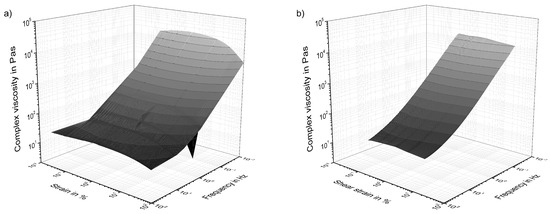 Going into detail for the strain-dependent rheological properties of the material, an initial plateau in the complex viscosity for all evaluated test frequencies occurs until a critical strain is reached. After that, distinct shear-thinning occurs; compare Figure 6. All curves of , except for 80 Hz, show a solid-liquid transition.