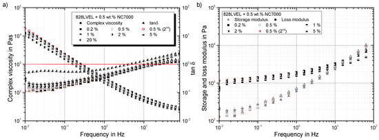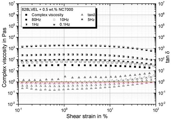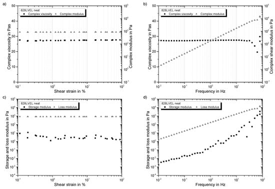 Firstly, strain- and frequency-sweeps were performed for the neat epoxy resin to verify the Newtonian-like behavior. The complex viscosity of the system is independent of the applied strain amplitude and frequency, referring to Figure 4a,b, respectively. Storage and loss modulus show an independence of applied strain in strain-sweeps, as well (see Figure 4c). However, they increase with increasing frequency (see Figure 4d). In both tests, is two magnitudes higher than , revealing a fluid-like behavior of the resin. Therefore, taking Equation (8) into account following dependency is valid for the complex modulus: