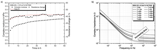 To verify the time-dependent behavior of the material, an oscillatory measurement with parallel DC measurement was performed; see Figure 5a. Beside that the change of AC electrical behavior was measured according to [44] to reveal the structural changes after the dispersion process; compare Figure 5b. Structural changes were highest in the first 10 h after dispersion. Therefore, the material was stored for 72 h before testing to achieve the steady state. The development of was fitted by a molecular growth model with the following formula [46] utilizing the Levenberg–Marquardt algorithm: