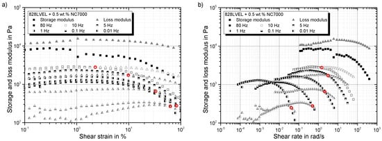 In Figure 7a, the storage modulus and loss modulus are plotted vs. the applied shear strain. The cross over, indicated by red circles, occurs for higher test frequencies at lower strains. This is considered as the yield point of the material, allowing the explanation of shear rate dependency. With Equation (6), the previous plot can be transferred into a shear rate -dependent plot of storage and loss modulus; compare Figure 7b. The cross over occurs for higher frequencies at higher shear rate. Therefore, the structural change of the material seems to be shear rate independent. To reveal the structural changes in the material during the strain-sweeps, the electrical resistance was measured simultaneously.