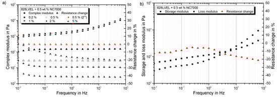 The electrical resistance change and complex modulus in dependency of the frequency are plotted in Figure 10a. For all curves, the resistance decreases and ends up in a plateau after 1 Hz. Measuring the same sample a second time leads to no further change in resistance. This is shown exemplarily for a wt.% filler concentration. The fact that with increasing frequency, no further changes in resistance occur leads to the assumption that the changes in the filler network structure are less dependent on frequency. For a strain amplitude of 20%, the resistance is constant and decreases further at frequencies of 1 Hz; compare Figure 10b.
