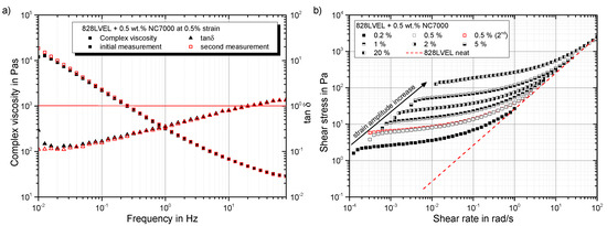 The influence of a second measurement of the same sample in a frequency-sweep is given in Figure 11a. The initial plateau disappears, indicating no further changes in the network structure. Plotting shear stress vs. shear rate in Figure 11 shows an asymptotic convergence to the material behavior of the neat resin for high frequencies. Here again, the structural changes occur for low frequencies and therefore in the first oscillation cycles. At high frequencies, only the resin seems to be excited. A reasonable assumption is that the rigid particles are too inert to follow the movement of the oscillation. High frequency tests allow the measurement of the matrix viscosity without affecting the network structure.