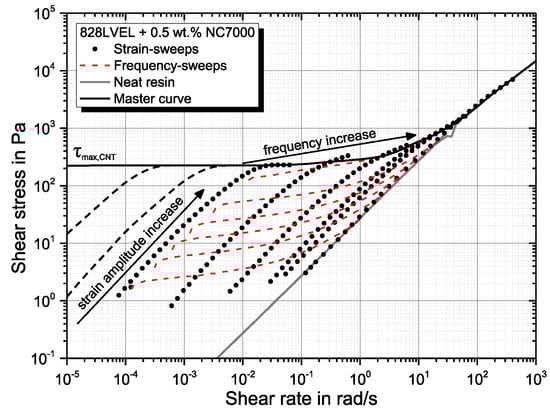 the material responses as shown in Figure 12. At low frequencies, the CNT network dominates the material behavior. The stress scales with applied strain. For higher frequencies, the strain rate increases at constant strain, and therefore, the polymeric behavior becomes more dominant. For , shear-thinning occurs, resulting in no further increase of stress at low frequencies. By this observation, the superior efficiency of continuous dispersion processes like three-roll-milling to oscillatory methods like ultrasonication can be justified. The shear rate for ultrasonication is far higher, but the total amplitudes are lower compared to TRM. This study proved that high shear amplitudes are mandatory to separate agglomerates. Ultrasonication leads, despite the high energy level, not to the separation, but to the fracture of single rigid particles. The shear rate has a minor influence. The pretended shear-thinning in frequency-sweeps is not due to changes in the network structure, but rather corresponds to the rheological behavior of the polymer matrix. For steady shear flows, the absolute amplitude should be considered stronger than the shear rate.