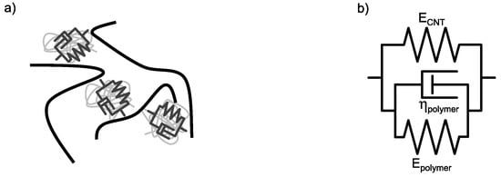 Schematical sketch of the (a) CNT-polymer-composite adapted from [23] and (b) the applied material model using mechanical elements.