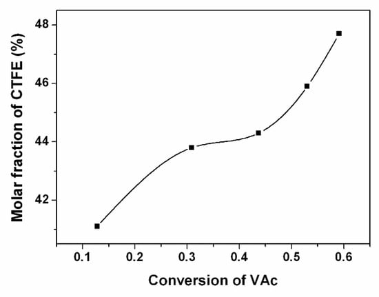When the initial molar ratio of CTFE to VAc is fixed at four-fold, molar fractions of CTFE in the resulted copolymers increase with the monomer conversions (shown in Figure 2), due to the increase in the real-time molar ratio of CTFE to VAc in the polymerization process.
