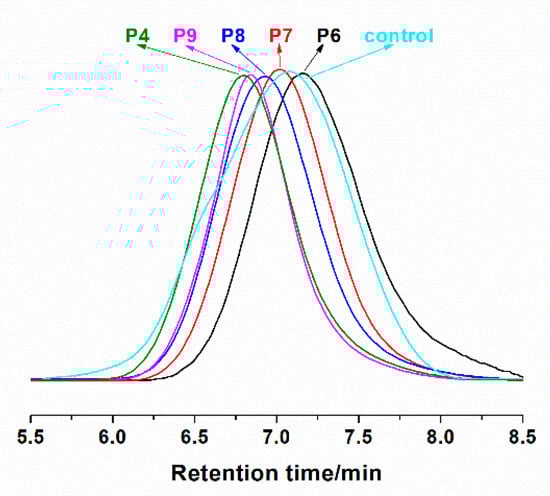 It can be observed that molar masses determined by GPC (Mn,GPC) are higher than the theoretical values (Mn,th), which is probably due to the standards of polystyrenes used in the calibration. The molar masses of poly(CTFE-co-VAc) increase linearly with the monomer conversions, and the dispersities (Mw/Mn) remain at about 1.5 up to high conversions (shown in Figure 3). The linear kinetic curve could be ascribed to the quasi-alternating copolymerization of CTFE and VAc. Meanwhile, a control experiment with the same condition of sample P8 but without adding Co(acac)2 was conducted. The Mn,GPC of the obtained copolymer is 15,500, and the value of dispersity is as high as 2.59. Figure 4 shows the GPC traces of these copolymers.