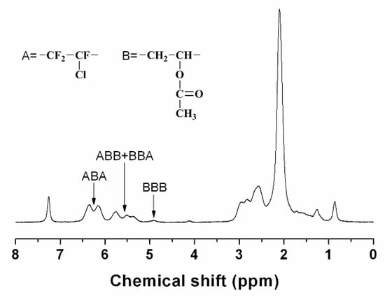 The chemical structure of the fluorinated copolymer was characterized by 1H and 19F NMR spectroscopy, and Sample P7 was chosen as a representative. For Sample P7, the molar ratio of the CTFE unit to VAc unit in the copolymer is 43.8/56.2, which is very close to the alternating structure. Figure 6 shows the 19F NMR spectrum of sample P7. There are a series of multiplets located between −108 and −132 ppm, which are attributed to the groups of CF2 and CFCl in the chain backbone. Meanwhile, no signal appears at −100 ppm in 19F NMR spectrum, which indicates that there are no CTFE-CTFE diads in the polymer chains []. Figure 7 shows the 1H NMR spectrum of poly(CTFE-co-VAc), where A represents the CTFE unit and B represents the VAc unit. The resonances located between 6.60 and 4.70 ppm can be attributed to the proton of methine in the VAc unit. As can be seen, there are four kinds of chain sequences in the copolymer, most of which have an alternating structure (ABA) that is followed by ABB or BBA, and very few BBB chain sequences exist. Signals appearing between 3.10 and 0.80 ppm belong to the methene of the VAc unit in the backbone and the methyl of the VAc unit in the pendent group.