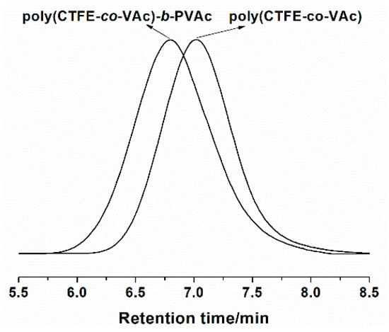 GPC traces of poly(CTFE-co-VAc) (Sample P7, Mn,GPC = 19,600, Mw/Mn = 1.51) and poly(CTFE-co-VAc)-b-PVAc (Mn,GPC = 39,300, Mw/Mn = 1.57).