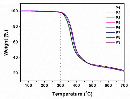 Thermal stability of the obtained fluorinated copolymers was examined by thermogravimetric analysis (TGA) under a nitrogen condition. Figure 9 shows the thermograms of the copolymers. Severe degradation starts from about 300 °C, which demonstrates that the obtained fluorinated copolymers have good thermal stability.
