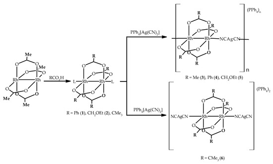 Following the antecedents described above, we have prepared dirhodium-silver anionic one-dimensional coordination polymers of (PPh4)n[Rh2(μ-O2CR)4Ag(CN)2]n (R = Me (3), Ph (4), CH2OEt (5)) formula by reaction between discrete dinuclear building blocks with two labile ligands in the axial positions, [Rh2(μ-O2CR)4L2] (R = Me, Ph (1), CH2OEt (2); L = solvent molecules) and PPh4[Ag(CN)2] (Figure 1). The same approach has also lead to a molecular compound of (PPh4)2{Rh2(μ-O2CCMe3)4[Ag(CN)2]2} (6) formula. The presence of intermolecular interactions including multiple phenyl embraces between the phenyl rings of the PPh4+ counterion have also been examined.