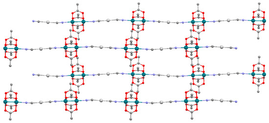 Heterometallic one-dimensional compounds containing M2 units with direct metal-metal bonds and other transition metal complex are very useful as functional materials due to their versatile physical and chemical properties [23,24]. A very useful strategy to form heterometallic complexes has been developed by Petrukhina et al. [25] using the electrophilic tetrakis(trifluoroacetato)dirhodium(II) complex, [Rh2(μ-O2CCF3)4]. Thus, the reaction of [Rh2(μ-O2CCF3)4OCMe2]2 with the tetranuclear species [Cu4(O2CCF3)4] afforded a bidimensional coordination polymer of {[Rh2(μ-O2CCF3)4]·μ2-OCMe2·[Cu4(O2CCF3)4]} formula. In addition, several heterometallic Rh-Pt one-dimensional complexes have been described [26,27,28,29,30]. For example, {[Rh2]−[Pt2] −[Pt2]}n or [Rh2]−[Pt−Cu−Pt] polymers with dimetallic units joined by unbridged Pt-Rh metal-metal bonds have been obtained [26,27,28,29,30,31]. Moreover, a strategy to construct one-dimensional compounds from dirhodiumtetracarboxylato units, [Rh2(μ-O2CR)4]+ (R = Me, Et) using dicyanoaurate, [Au(CN)2]− groups as linker has been developed by our research group [32].