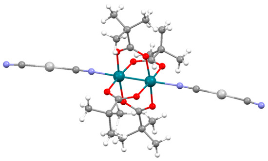 The structure of 6 is formed by discrete {Rh2(μ-O2CCMe3)4[Ag(CN)2]2}2− (Figure 6) and (PPh4)+ units. This compound was prepared following the same synthetic conditions employed to prepare 3a and 4 whose structure is polymeric. One would expect that the formation of a coordination polymer should be more thermodynamically favourable. However, a polymer could not be obtained in this case despite of the efforts made. The formation of a molecular compound instead of a coordination polymer should be related with a more efficient packing than that of a potential coordination polymer made of the same building blocks. The analysis of the crystal structure of 6 did not reveal any strong dirhodium-(PPh4)+ interaction but C-H····π interactions are observed involving the closest (PPh4)+ cations in the structure. Particularly, this pair of cations displays two nearly vertex-to-face intermolecular interactions at 2.860 and 2.939 Å (Figure 7 and Figure S13). Moreover, we hypothesize that the higher solubility of the trimethylacetato derivative in acetone causes the complex to remain longer in the solution during the crystallization favouring the formation of 6 instead of a coordination polymer. A similar reasoning has been used to explain the molecular nature of [Ru2Cl(µ-O2CCMe3)4(OH2)] [42] and the polymeric structure found in [Ru2Cl(μ-O2CPh)4] and [Ru2Cl(μ-O2CMe)4] [43,44]. Interestingly, the ethoxyacetate ligand gives the polymeric 5 whereas in the diruthenium complexes, this ligand leads to [Ru2Cl(μ-O2CCH2OEt)4], which contains both polymeric and molecular fragments [45]. These data suggest a strong influence of the solvent and the nature of the equatorial ligand in the molecular or polymeric nature on the paddlewheel dinuclear complexes.