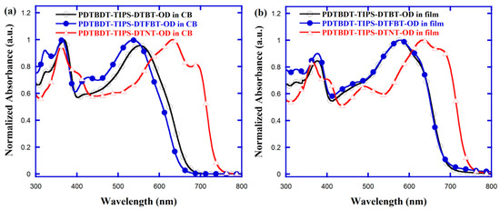 Normalized UV-vis absorption spectra of copolymers in diluted chlorobenzene (CB) solution of approximately 10−5 mol L−1 (a) and thin film state (b).