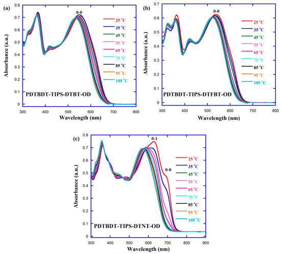It has been confirmed that with rising temperature the molecule motions of CPs are bound to be accelerated, resulting in a reduction of the absorption shoulder peaks with regard to the aggregation evoked by intermolecular π–π* transition. Namely, the distortion of the conjugated backbone is strengthened at the elevated temperature, leading to a decrease of the effective conjugation length of the polymer backbone, and hence the absorption peaks engendered by the localized π–π* transitions, and the ones emerged from ICT transitions are both blue-shifted [49,70]. To gain insight into the difference between fluorination and the replacement of BT with NT on the interchain π–π stacking in solution, temperature-dependent absorption (TD-Abs) spectra of these copolymers in CB solution were measured, as shown in Figure 3. It was exhibited that as the temperature increased from 25 °C to 105 °C, the ICT absorption peaks (0–0 peak for the BT-based CPs and 0–1 peak for the NT-based CP) were all blue-shifted and the absorption strength decreased. In detail, the blue-shifted values (Δλ) and the decreased absorption strength (ΔA) were 20 nm and 3.88% for PDTBDT-TIPS-DTBT-OD; 15 nm and 3.20% for PDTBDT-TIPS-DTFBT-OD; and 62 nm and 7.47% for PDTBDT-TIPS-DTNT-OD, respectively. Furthermore, the absorption peak (0–0 peak) related to the aggregation was only observed in the PDTBDT-TIPS-DTNT-OD and it showed a trend of blue-shifting and decreasing, and it completely disappeared until the temperature was heated to 65 °C. As observed from the results, the order of aggregation ability in the CB solution should be: PDTBDT-TIPS-DTNT-OD > PDTBDT-TIPS-DTFBT-OD > PDTBDT-TIPS-DTBT-OD [70].