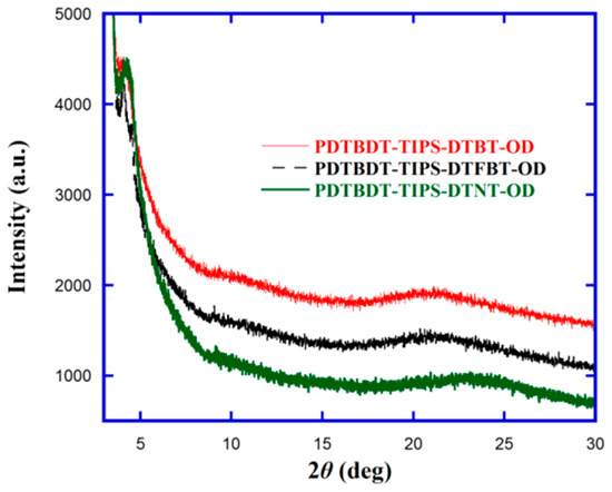 To get a deeper perspective on the impact of fluorination and the substitution of BT with NT on intermolecular interaction in the film state, X-ray diffraction (XRD) was adopted to investigate the formation of ordered structures within these studied polymers. The preparation conditions for these pristine polymer films was casted from polymer CB solution onto glass substrate. As illustrated in Figure 4, all copolymers exhibited two discernible peaks. The first peaks in a small angle region were located at 2θ of 4.00° for PDTBDT-TIPS-DTBT-OD, 4.08° for PDTBDT-TIPS-DTFBT-OD, and 4.25° for PDTBDT-TIPS-DTNT-OD, such that the distance of the polymer backbone separated by the flexible side was 22.06, 21.63, and 20.77 Å, respectively, based on the Bragg’s law (i.e., λ = 2dsinθ) [71]. The broad diffraction peaks at the wide-angle region, which reflects the π–π stacking distance, were located at 2θ of 20.62° for PDTBDT-TIPS-DTBT-OD, 2θ of 20.91° for PDTBDT-TIPS-DTFBT-OD, and 23.25° for PDTBDT-TIPS-DTNT-OD, respectively, corresponding to π–π stacking distances of 4.30 Å, 4.24 Å, and 3.89 Å. It was inescapably clear that the order of aggregation in the solid film state was PDTBDT-TIPS-DTNT-OD > PDTBDT-TIPS-DTFBT-OD > PDTBDT-TIPS-DTBT-OD, which was in accordance with the previous one in the CB solution.