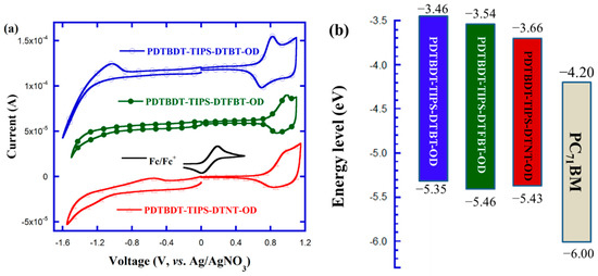 It is well known that the EHOMO, ELUMO, and electrochemical bandgap () of as-prepared CPs were important parameters in photovoltaic application. Therefore, the cyclic voltammetry (CV) method was applied to characterize the electrochemical properties, and the EHOMO and ELUMO were estimated from the oxidation onset potential () and the reduction onset potential (), respectively. The CV curves were recorded in Figure 5a, and the detailed data were listed in Table 1. Three CPs exhibited the quasi-reversible p-doping and n-doping processes, which were important for p-type semiconductor materials. We could see that the s for PDTBDT-TIPS-DTBT-OD, PDTBDT-TIPS-DTFBT-OD, and PDTBDT-TIPS-DTNT-OD were observed at around 0.67, 0.78, and 0.75 V, respectively. Note that the reference electrode was calibrated using the ferrocene–ferrocenium (Fc/Fc+) redox couple, which had redox potential with an absolute energy level of −4.80 eV relative to the vacuum energy level [72]. Meanwhile, this potential φ1/2 of the Fc/Fc+ redox couple was found to be 0.12 V under the exact same conditions. Accordingly, the EHOMO and ELUMO were calculated from the following equation: EHOMO = −e( + 4.68) (eV) and ELUMO = −e( + 4.68) (eV), where and are the onset oxidation and/or the reduction potentials vs. Ag/AgNO3, and the corresponding EHOMO/ELUMO values were approximately −5.35/−3.46 eV, −5.46/−3.54 eV, and −5.43/−3.66 eV for PDTBDT-TIPS-DTNT-OD, PDTBDT-TIPS-DTFBT-OD, and PBDT-TIPS-DTNT-OD, respectively. Clearly, the depressed EHOMO values were 0.11 and 0.08 eV for fluorination and the replacement BT with NT, respectively, which were both prone to obtaining high a VOC in the PSCs [4]. The was calculated from the equation = e( − ) (eV), and the values were 1.89, 1.92, and 1.77 eV for DTBDT-TIPS-DTNT-OD, PDTBDT-TIPS-DTFBT-OD, and PBDT-TIPS-DTNT-OD, respectively. These observed values were slightly higher (0.07–0.10 eV) than those of the , which presumably resulted from the exciton binding energies of the CPs and/or the interfacial barriers for charge injection [73]. For a better comparison, the energy levels diagram of the three donor copolymers and PC71BM is described in Figure 5b. It could be inferred that all the polymers were suitable for use as donor materials to match well with the PC71BM, which had LUMO gaps of 0.54~0.74 eV, exhibiting sufficient driving force to facilitate an exciton dissociation at the D–A interfaces, thereby guaranteeing energetically favorable electron transfer to overcome the binding energy of the intrachain exciton [11]. Interestingly, the replacement of BT with NT could simultaneously achieve the balance of deepening the EHOMO and reducing the bandgap of the donor polymer, which differed from the observations in PBDT-DTNT [25] and PBDTT-TNAT [11]. This meant that an obviously decreased bandgap of the PDTBDT-TIPS-DTNT-OD principally benefited from the remarkably deepened ELUMO.
