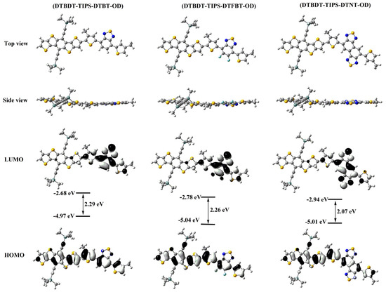 To further inspect the effect of fluorination and replacement of the BT with NT on the molecular backbone conformation and the electron density distributions, the calculations were carried out the using density functional theory (DFT) calculation on the B3LYP/6-31G* basis set, implemented in the Gaussian 09 program suite as in Reference [74]. To save time and cost, the long-branched OD side chain and TIPS groups were substituted by methyl and trimethylsilylethynyl, and the corresponding polymer backbones were simplified into oligomers with one repeating units (unimer), prior to the calculations. As presented in Figure 6, the HOMO orbitals are delocalized across the whole conjugated main chain, whereas, the LUMO orbitals are preferentially concentrated in the corresponding electron-deficient segments. These DFT calculations implied that the effective charge-transfer process would occur between the DTBDT-TIPS and BT/FBT/NT units. Accordingly, the calculated EHOMO, ELUMO, and bandgap were −4.97, −2.68, and 2.29 eV for PDTBDT-TIPS-DTBT-OD; −5.04, −2.78, and 2.26 eV for PDTBDT-TIPS-DTFBT-OD; and −5.01, −2.94, and 2.07 eV for PDTDBT-TIPS-DTNT-OD, respectively. Clearly, the variation trend of the EHOMO was deepened by the fluorination and replacement of the BT with NT, agreeing well with results from the previous CV measurements. Moreover, it has already been demonstrated that good planarity of the polymer backbone is conducive to ensuring closer π–π stacking, which is propitious to internal aggregation, charge transfer, and molecular conjugation to engender a lower band gap [2]. Consequently, the dihedral angles θ1 between the donor DTBDT-TIPS unit and the alkylthiophene bridge, θ2, and θ3, between the alkylthiophene bridge and the acceptor BT/FBT/NT moiety were 21.79°, −7.24°, and −4.10° for the DTBDT-TIPS-DTBT-OD; 22.29°, −1.06°, and −0.17° for the DTBDT-TIPS-DTFBT-OD; and 15.65°, −8.78°, and 2.96° for the DTBDT-TIPS-DTNT-OD, respectively, as shown in Figure S13. The molecular planarity was improved by both the fluorination and replacement of BT with NT, in good accordance with the previous XRD analyses and TD-Abs measurements. Interesting to note that the calculated data were all higher in energy than those from the experimental test, since in the calculation process only the finite unimer and the short side chain were considered in the DFT model to describe the conjugated polymers. Notwithstanding, these theoretical calculation values agreed with the trends observed in the experiment and still disclosed the interrelation amongst the molecular structure, optoelectrical property, and thus the PV performance.