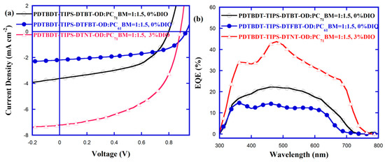 Owing to PC71BM bearing similar electronic properties to PC61BM, but with a considerably higher absorption coefficient and a broader absorption spectrum, PC71BM was further applied instead of PC61BM to maximize the PCE [81]. As seen in Figure S13 and Table S3, the PCE of the PDTBDT-TIPS-DTBT-OD based device slightly increased by approximately 7.3% (from 1.37% to 1.47%), which originated from a 9.0% enhancement in the JSC (from 3.32 to 3.62 mA cm−2) and the FF (from 45.21% to 50.93%), but with a decreased VOC (from 0.91 V to 0.80 V). Regrettably, an improvement in the PCE for the fluorinated system was not observed. However, as for the PDTBDT-TIPS-DTFBT-OD-based device, an 11.2% enhancement in the PCE (from 3.03% to 3.37%) was observed, and this improvement was ascribed to the 2.56% (from 7.03 to 7.21 mA cm−2) and 3.60% (from 49.39% to 52.99%) increases in the corresponding JSC and FF, whilst the VOC remained stable. Evidently, these variations agreed well with the corresponding EQE curves in Figure S15, in particular, there existed a distinct improvement ranging from 400 to 550 nm in the EQE profile related to the contribution of the PC71BM.