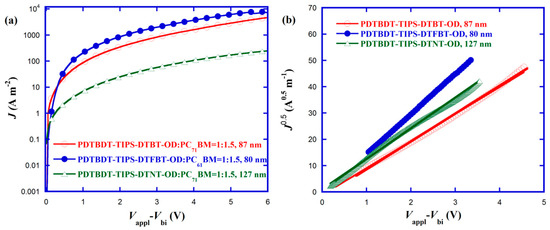 The hole mobility of the active layer was measured from the J–V curves obtained under dark current using the steady state space charge-limited current (SCLC) method, with the hole-only device configuration of the ITO/PEDOT:PSS/active layer/MoO3/Ag. The processing conditions for the active layers were the optimized one. The J–V curves were fitted using the Mott-Gurney square law as References [65,66]: , where J is the current density, ε0 is the free space permittivity (8.85 × 10−12 F m−1), εr is the dielectric constant of the polymer (assumed to be 3), μ is the hole mobility, L is the thickness of the BHJ active layer film, and the effective potential V = (Vappl − Vbi): where Vappl is the applied potential and Vbi is the built-in voltage resulting from difference in the work function of the anode and cathode. Finally, the mobility was extracted from the slope and L according to , by linearly fitting J1/2 with V.