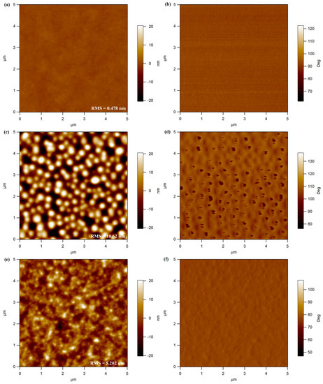 Tapping Atomic force microscopy (AFM) height (left) and phase (right) images of the active layers of PDTBDT-TIPS-DTBT-OD/PC71BM (1:1.5, 0%DIO, a,b), PDTBDT-TIPS-DTFBT-OD/PC61BM (1:1.5, 0%DIO, c,d) and PDTBDT-TIPS-DTNT-OD/PC71BM (1:1.5, 3%DIO, e,f). Image size: 5 μm × 5 μm.