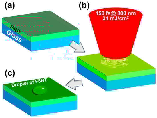 Annealing of the F8BT thin film using femtosecond laser pulses at 800 nm. (a) Poly(9,9-dioctylfluorene-co-benzothiadiazole) (F8BT) film spin-coated on a glass substrate. (b) Laser pulses were focused onto the surface of the F8BT film. (c) Production of polymeric droplets.