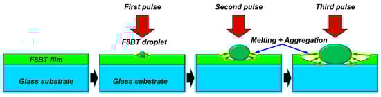 Thus, the mechanism can be understood as a layer-by-layer melting of the polymer film with successive irradiation by femtosecond pulses. At each pulse irradiation, both surfaces of the previous droplet and the bared film gets melted, and the newly melted layer is aggregated to the droplet to form a larger one. This process is repeated until the whole material within the irradiation area by the laser spot is used up, as depicted schematically in Figure 3. We need to stress that the formation of droplets starts from the first pulse irradiation, as illustrated in Figure 3a, and there is no thermal accumulation during the irradiation by the following pulses. However, the interaction with the following pulses melted more polymers, the aggregation accumulated and enabled the growth of the droplets. Thus, there exists a threshold fluence (μJ/cm2) for a single pulse, instead of a threshold number of pulses, although we were able to observe the droplets under the optical microscope after 20-pulse irradiation in our experiment, where the amount or the size of the melted polymers was already large enough.