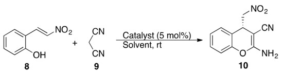 2.4.2. General Procedure for Preparation of 2-Amino-4-(nitromethyl)-4H-chromene-3-carbonitrile from 2-(2-Nitrovinyl)phenol Derivative