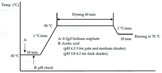 To reduce wastewater discharges and environmental impacts, various methods were used to improve the exhaustion and fixation of dyes on wool fiber. These attempts included (a) pretreatment or modification of wool fiber before coloration [,,,,,,]; (b) synthesis of novel dyestuffs [,]; (c) microencapsulation with liposomes [,]; (d) reuse of dyebath [] and seawater []; (e) foam dyeing []; (g) ultrasound-assisted dyeing [,,]; and (h) solvent-assisted dyeing using mixed solvent [], supercritical critical fluid, and/or reverse micelle [,,,,,].
